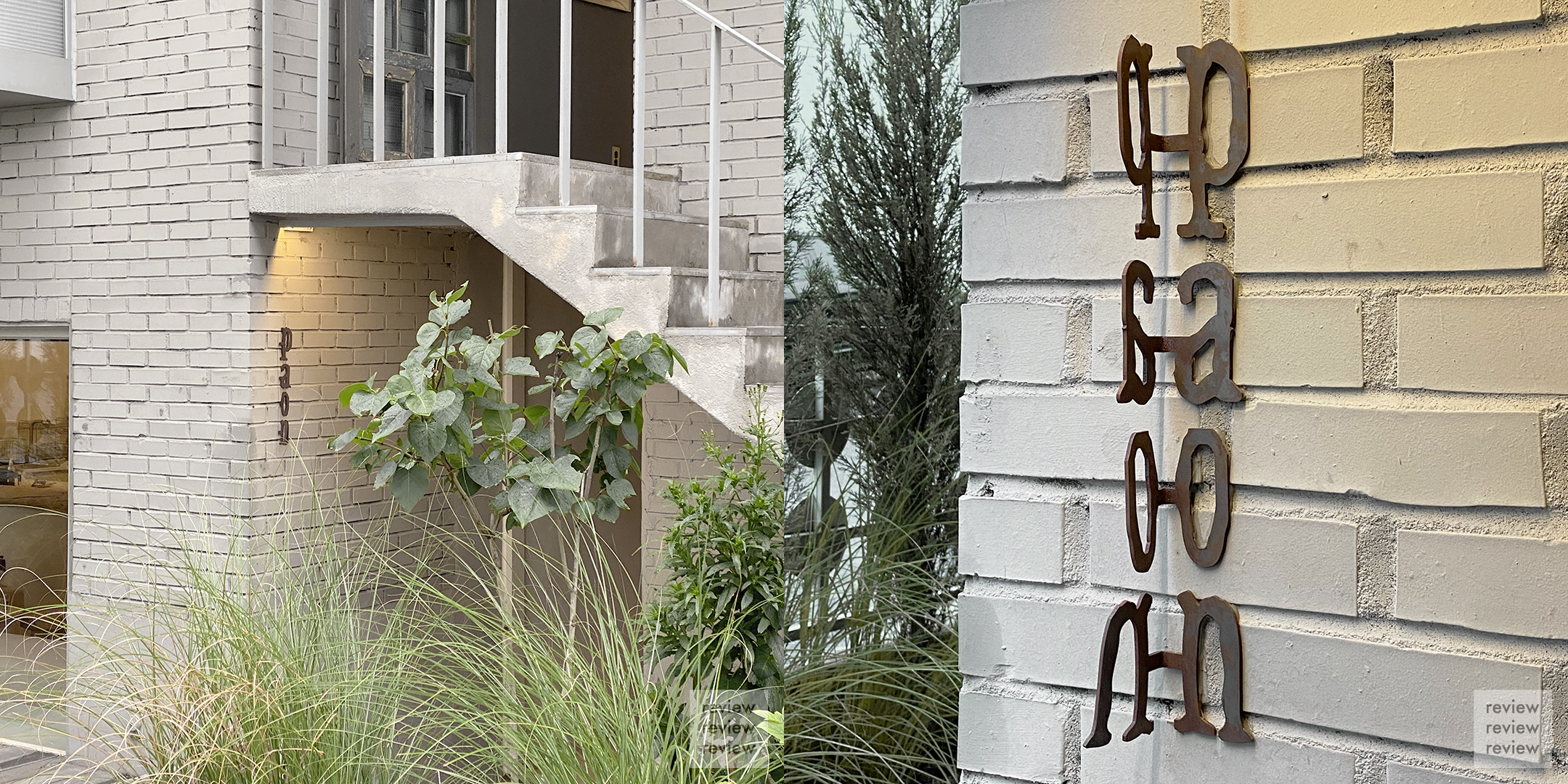 밝은 회색으로 칠해진 벽졸 건물 반지하 같은 1층에 위치하고 있어요. 건물 전면과 측면에 화단이 잘 꾸며져 있고 관리가 잘 되어있네요.^^
