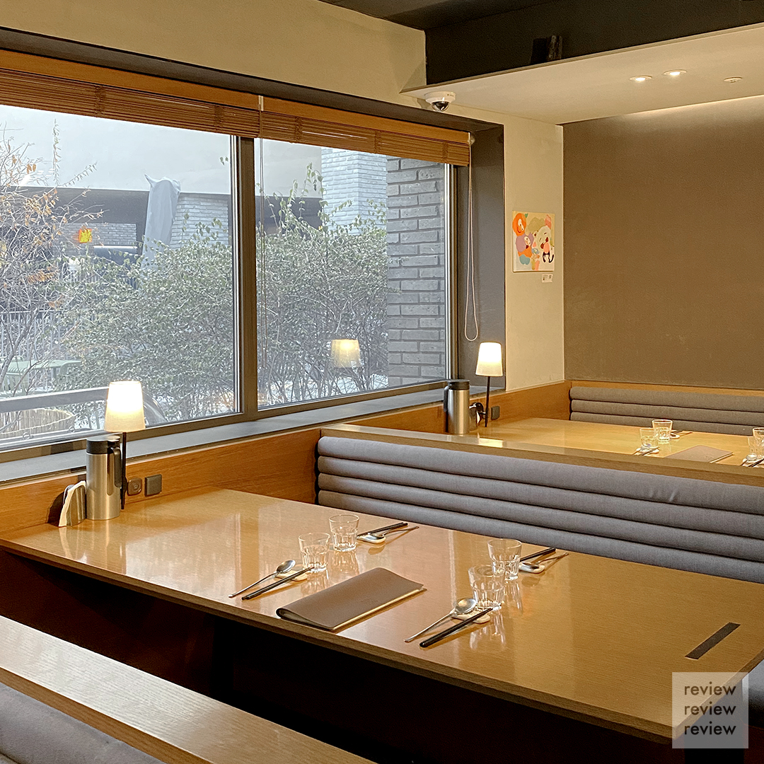내부는 크게 두 공간으로 나누어져 있어요. 전실을 통해 들어오면 카운터가 있고 양쪽으로 두 개의 공간이 있어요. 좌측에는 창이 있는 공간이 있고 우측은 주방과 바 테이블 공간이 있어요. 저희는 창을 더 좋아하기에 창쪽 공간에 자리를...