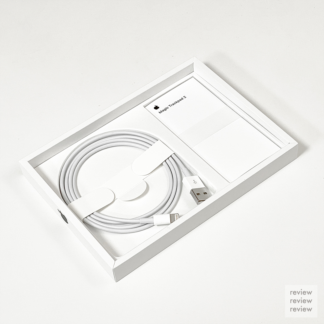 트랙패드를 꺼내 주면 아래에 다른 구성품들이 모습을 드러냅니다. 제품 설명서와 USB-C-Lightninig 케이블이 사이좋게 자리를 잡고 있습니다. ㅎㅎ