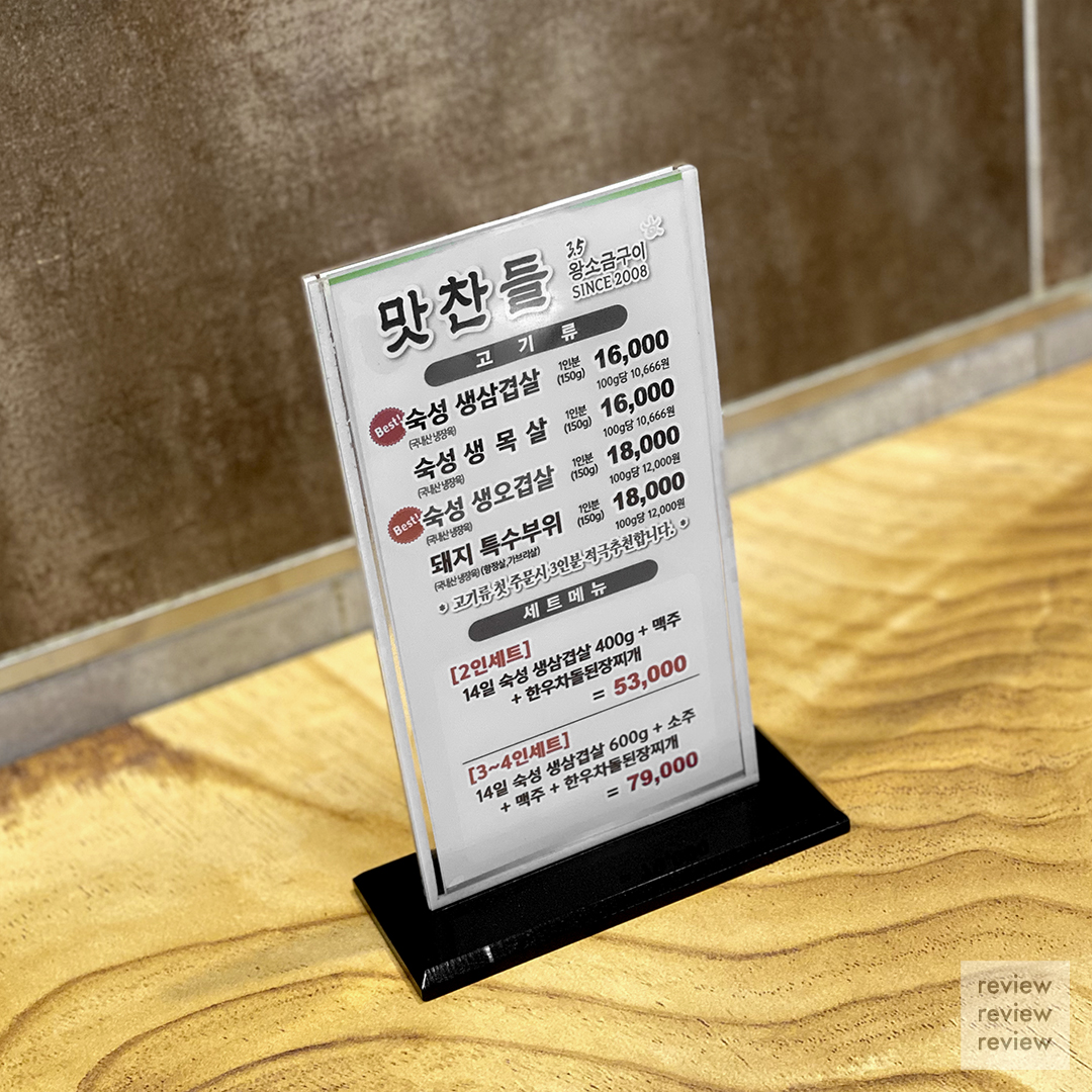 메뉴를 살펴볼까요? 동료와 뭘 먹을까 고민을 하다가 2인세트(53,000원) 메뉴를 주문했어요. 2인세트에는 14일 숙성 삼겹살 400g, 맥주, 한우차돌된장찌개로 구성된 세트입니다. ㅎㅎ 2인이 먹기에 딱 좋을 거 같네요.^^