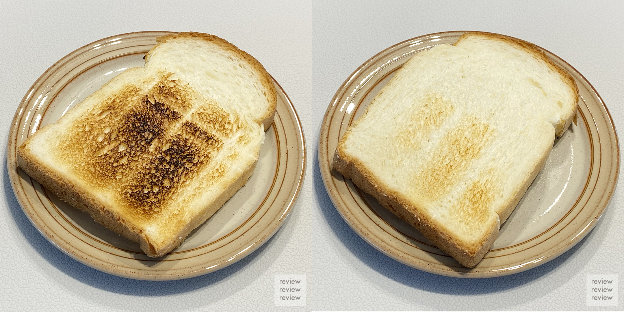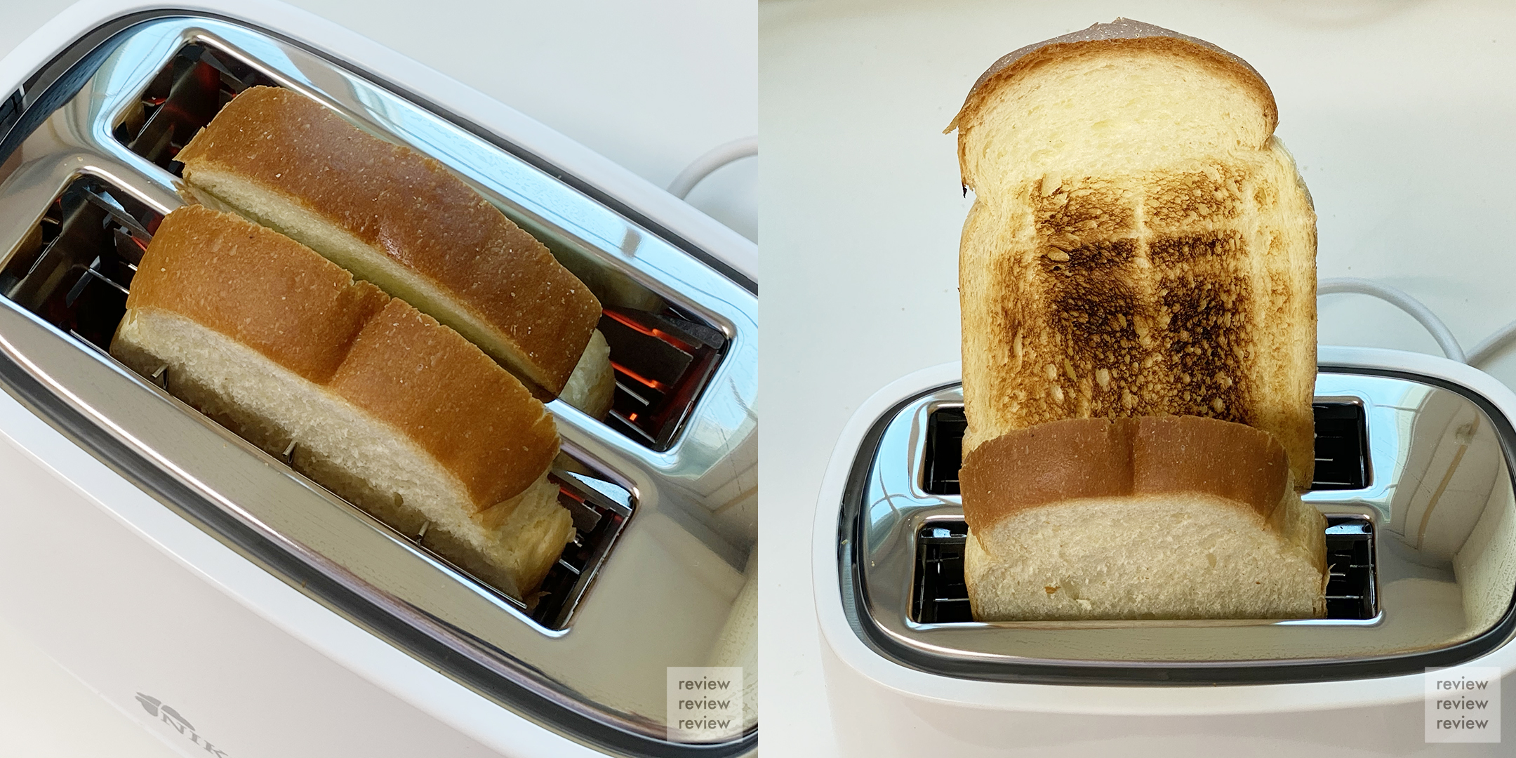 아래 사진은 2단계로 구운 식빵 앞뒷면입니다. 탄 부분이 토스터 슬롯 중앙을 바라보는 면이에요. 토스터 구조를 보니 빵이 중앙 열선에 좀 더 가까이 고정돼서 그런 것 같습니다. 그렇다 보니 반대면은 적당히 구워진 것 같네요.