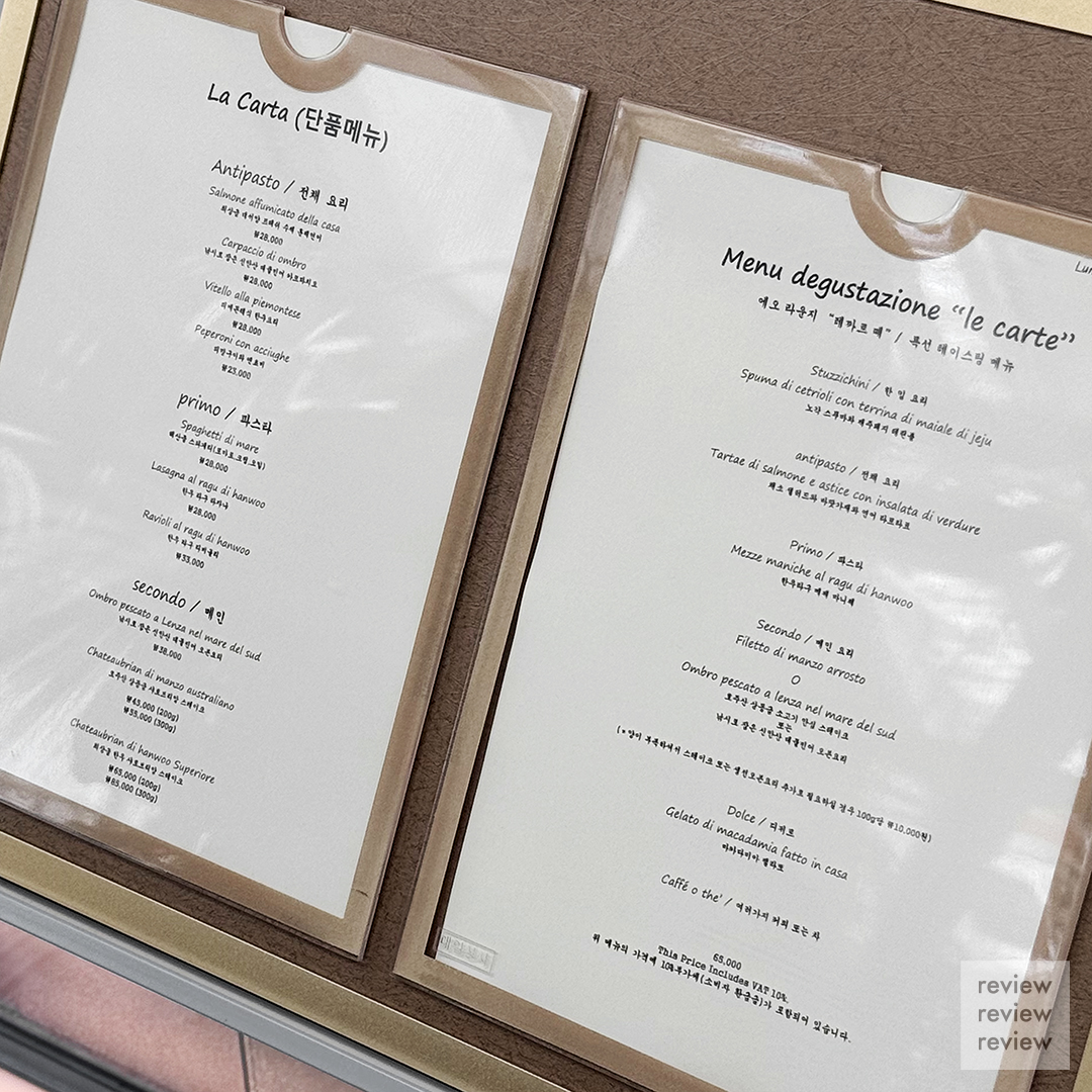 자리 잡고 메뉴판 사진을 못 찍어서 외부 메뉴판으로 대체합니다. 메뉴는 단품 메뉴와 코스 메뉴가 준비되어 있어요. 저희는 간단히 먹기 위해 단품 메뉴를 골랐습니다.^^ 방문했던 점심시간에는 코스가 1인 기준 65,000원에 구성되어 있네요.
